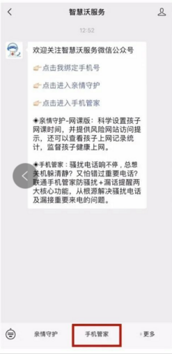 (2)进入【智慧沃服务】公众号,点击【手机管家】进行设置。