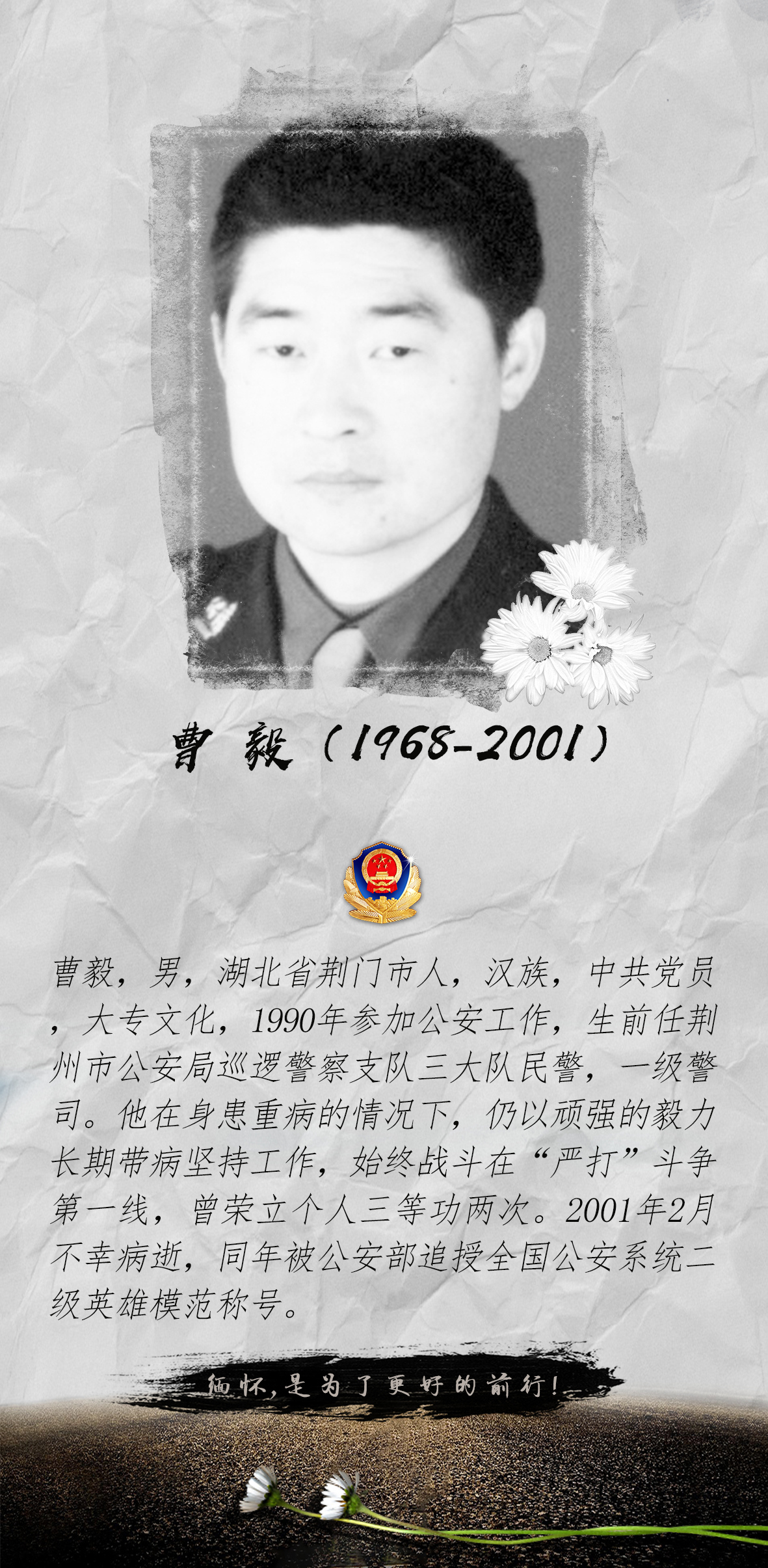 曹 毅 (1968-2001),男,湖北省荆门市人,汉族,中共党员,大专文化,1990年参加公安工作,生前任365bet不能注册_365bet游戏下载_天天365游戏中心官网公安局巡逻警察支队三大队民警,一级警司。他在身患重病的情况下,仍以顽强的毅力长期带病坚持工作,始终战斗在“严打”斗争第一线,曾荣立个人三等功两次。2001年2月不幸病逝,同年被公安部追授全国公安系统二级英雄模范称号。