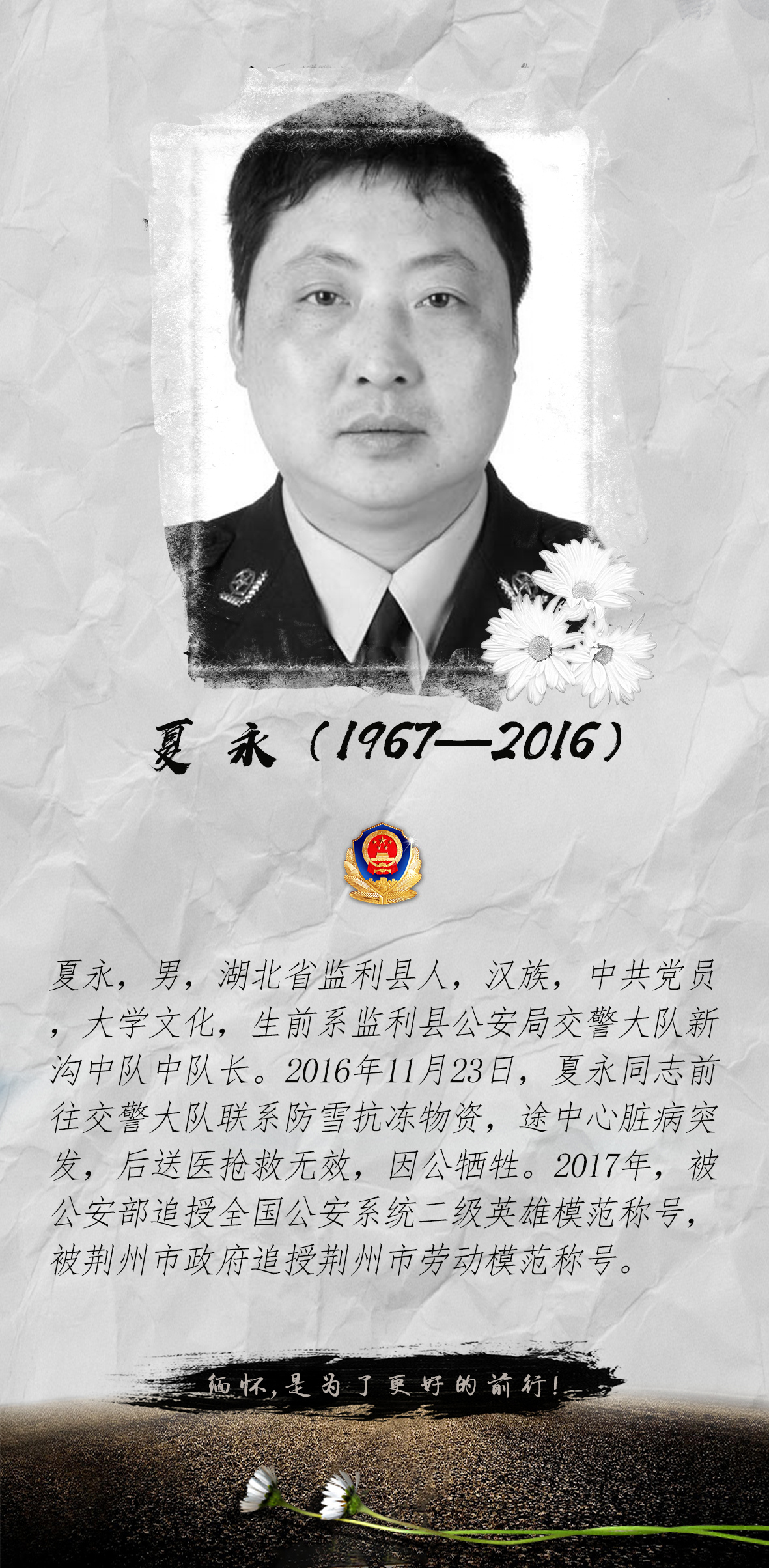 夏永,男,湖北省监利县人,汉族,中共党员大学文化,生前系监利县公安局交警大队新沟中队中队长。2016年11月23日,夏永同志前往交警大队联系防雪抗冻物资,途中心脏病突发,后送医抢救无效,因公牺牲。2017年,被公安部追授全国公安系统二级英雄模范称号,被365bet不能注册_365bet游戏下载_天天365游戏中心官网政府追授365bet不能注册_365bet游戏下载_天天365游戏中心官网劳动模范称号。
