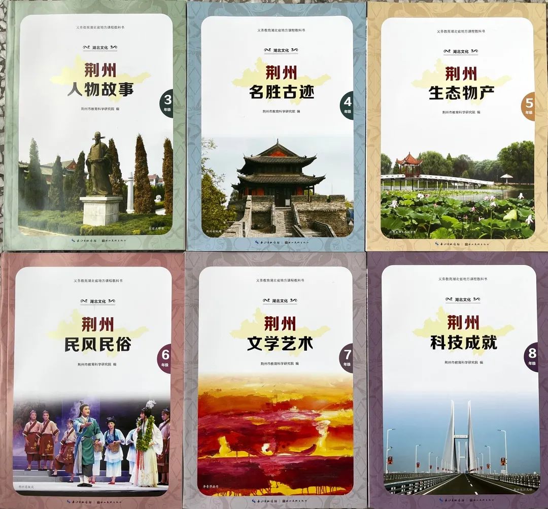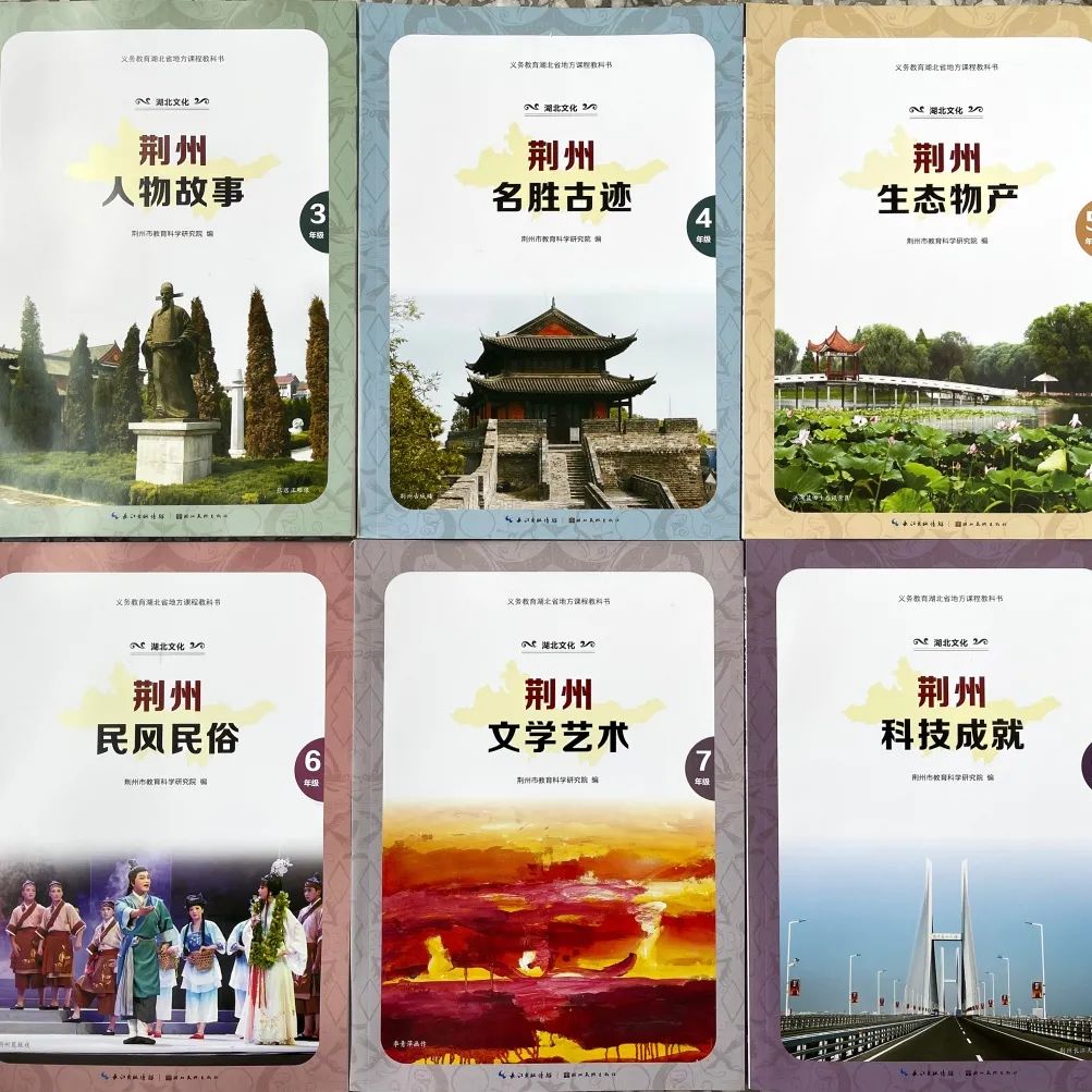义务教育湖北省地方课程教科书《湖北文化——荆州篇》,共为6册,其中小学4册,初中2册。以六个学习模块总体反映并引领学生探究荆州古今文明主脉、民俗文化主线、生态水系源流、社会发展变迁、群星照耀荆楚、面向未来构想。市教科院从选题筹划、队伍组建到分册编写,历时5年,2015年2月由长江出版传媒 湖北美术出版社正式出版,全面反映荆州历史人物、名胜古迹、生态物产、民风民俗、文学艺术、科学成就,2020年,针对荆州城市定位新变化和城市建设新成就,重新予以修订。
