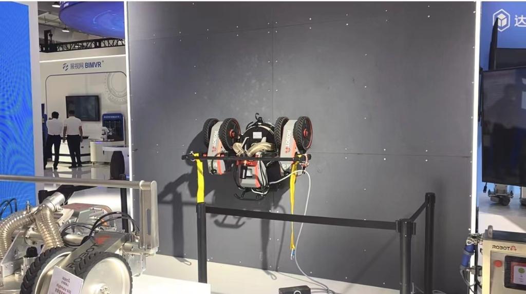 大门刚打开,一款“飞檐走壁”的机器人即吸引了众多目光。工作人员介绍,这款机器人可代替人工在高危环境下进行清扫、除锈、检测、喷漆等作业。依靠自主研发的永磁吸附底盘,机器人能够牢牢吸附在三四十米高的钢铁壁面,还能灵活移动身躯,完成高空作业。