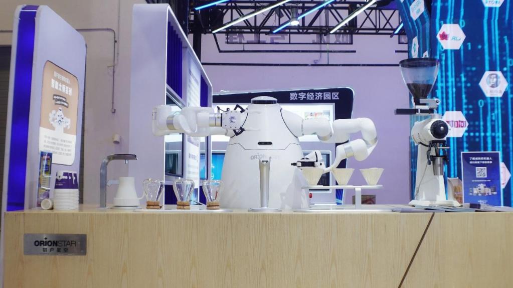 服贸会上,一个名为“智咖大师”的双机械臂协作机器人正在制作手冲咖啡。新华社记者 张漫子 摄