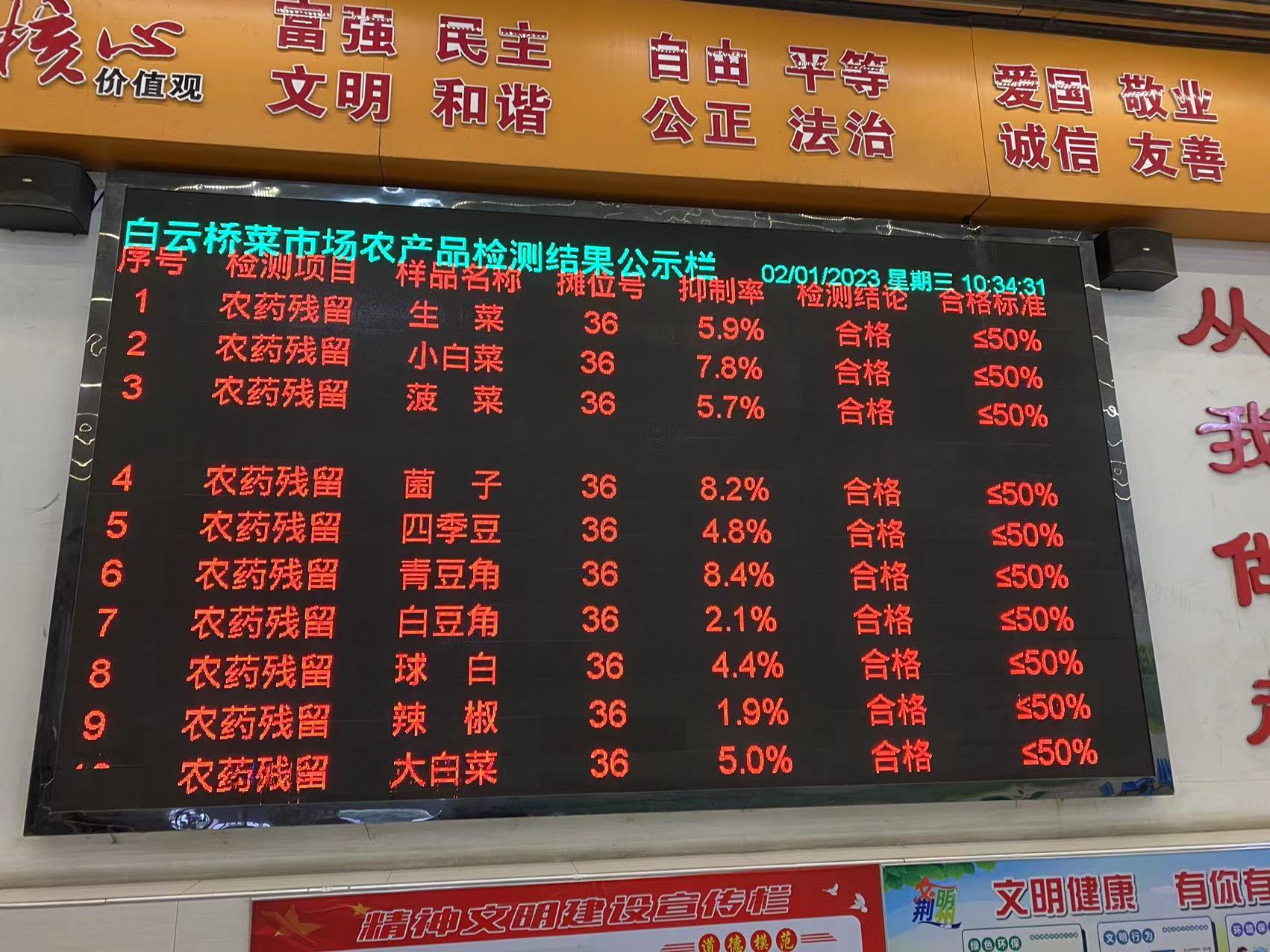 白云桥菜市场面积8000多平方米,共投资1000余万元,市场内现有门面74间,摊位36个,外围街区餐饮14家。市场内品种丰富,品类区域划分清晰,设有干货、水产、蔬菜、肉类、豆制品,熟食等区域。根据标准化菜市场的建设标准,市场内设置了食品安全快速检测室。