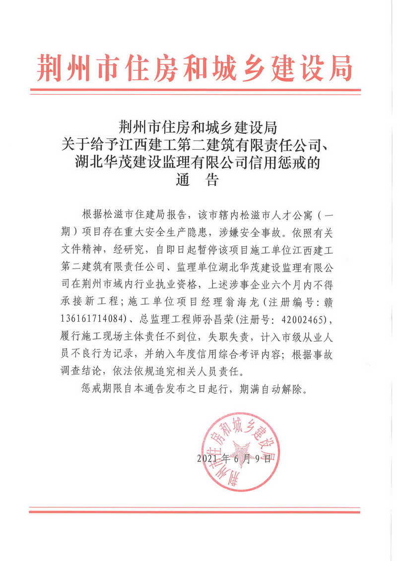 关于给予江西建工第二建筑有限责任公司、湖北华茂建设监理有限公司信用惩戒的通告
