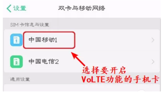 (3)进入【双卡与移动网络】后,选择需要关闭VoLte高清通话功能的手机运营商。